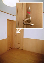猫のドアノブと、出入りのできる勝手口をつくりました。猫がキズをつけないように、壁には腰壁を貼りました。